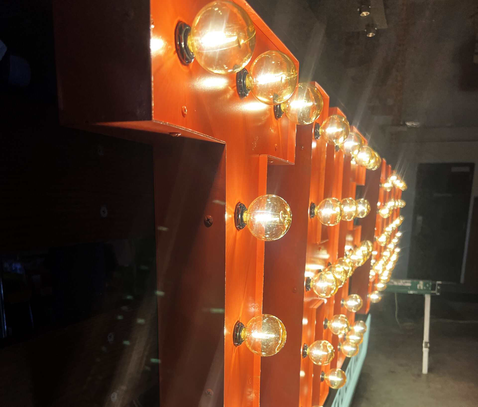 Finding modern LED products that kept the warm conventional lighting tones and struck the desired color palette was one of the lesser tasks because of the many brand options and vendor partners we hold. We turned to G2G Lighting for their marquee bulb style and visible filament illumination. The LED “neon” Aurora flex line was also our first choice for the closest color match and quality of product.